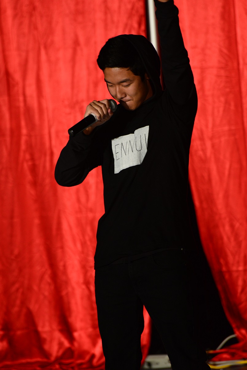 Matt Iida pumps up the night's spirit with his original rap that was written for an English project, "Fountain Valley". Photo by Ashley Le.