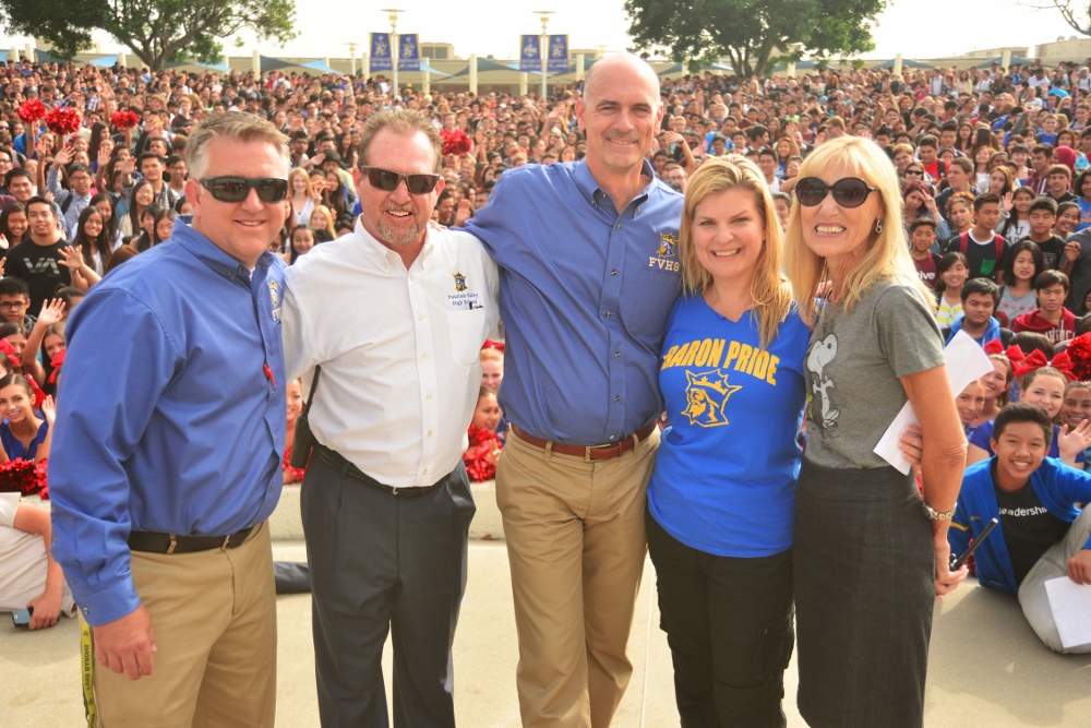 Last Friday, Fountain Valley High School staff and students gathered to celebrate Chris Herzfeld’s 14 years of service as principal with a farewell pep rally.