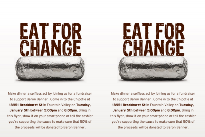 Come support Baron News at Chipotle on Brookhurst on Tuesday, January 5 from 5 to 8 pm. Be sure to show the flier at checkout. See our Facebook event for details and to print out the flier.