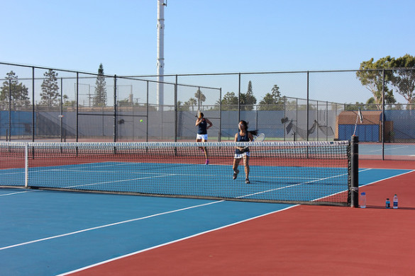 Doubles three player Kayla Korhonen (’17) hits her forehand as Jane Nguyen (’17) prepares herself for the next hit. Photo by Ivy Duong, Staff Photographer.by Anju Ito, Staff Writer