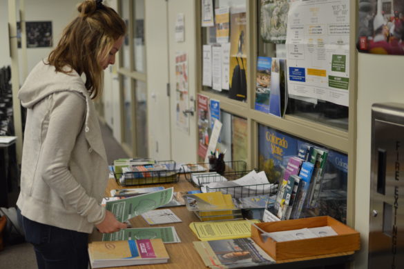 Olivia Krueger (’19) looks through various scholarship and college opportunities outside the career center in the library. Photo by Yasir Khaleq.
