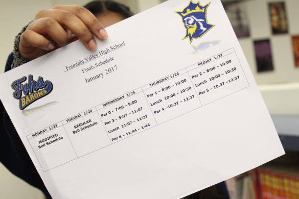 Throughout the years, Fountain Valley High School’s final schedule has been periods zero, one and six on the first day, period zero, two and five on the second day and period zero, three and four on the final day, until it was changed for second semester last year.