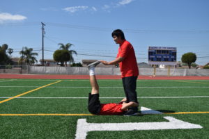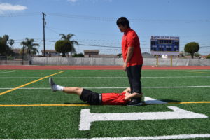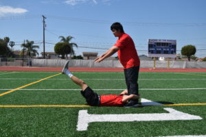 Start off by having your partner lay flat on their back. Position your feet to be on the either side of their head and have them hold on to your ankles. Your partner should lift up their legs together to create a 90 degree angle. Push on their feet and they should lower their legs in unison until it almost hits the ground.