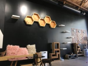 The interior is simple with just a concrete floor but one that is adorned with scratching posts, cat beds and cat trees. The walls are lined with special shelving units that double as steps for a cat to get an aerial view of the place, which offers different levels for customers to play with the cats.