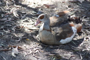 An odd looking Goose, the Egyptian Goose can easily be identified by the brown ring around its eye. This is actually an invasive species of geese that originated in Africa and was brought to the USA during the 1700s. During the spring breeding season, these geese are very aggressive and can hiss and crackle at enemies. These animals will eat just about everything and can be very harmful to the grass by killing it.