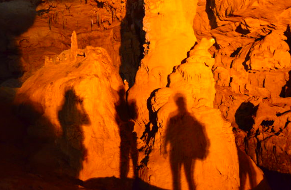 The shadows of me (left), my dad (center) and my mom (right) on a rock in a cave.