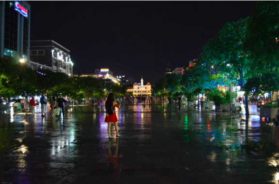 Nguyen Hue square in Saigon at night.