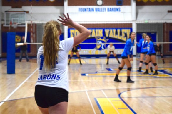 The first set against Huntington Beach starts off slow with sophomore Phoebe Minch scoring the first point as she hits deep corner in the backrow. A slight net violation right after sent the crowd and court into confusion, but the Lady Barons shook it off as Minch scores again with a swing down line. Right after, a freeball was sent to the Oiler side that caused miscommunication and a point for the Fountain Valley girls. Points for each team were scored through touches and net violations. Seniors Mia Laura and Jenna Everson go up to successfully block the Oilers hit which left the score at 6-12. Multiple effort plays were made on the Fountain Valley side including when Laura tooled the block but the girls lost the first set 14-25.