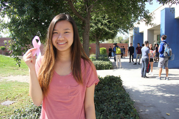 Senior Linh Doan shows her appreciation for Breast Cancer Awareness month by wearing pink and informing others. Photo by Kaitlyn Ngo.By Lindsey Nguyen & Suzane Jlelati, Staff Writers