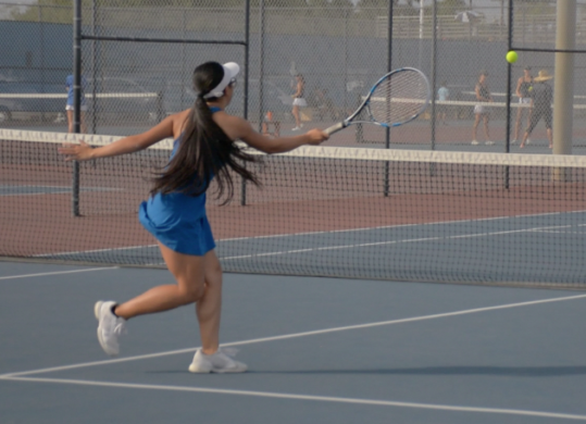 Christina Yu returns with a strong volley. Photo courtesy of Geovanna Escobar.by Vivian Yenson, Staff Writer