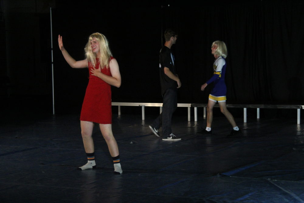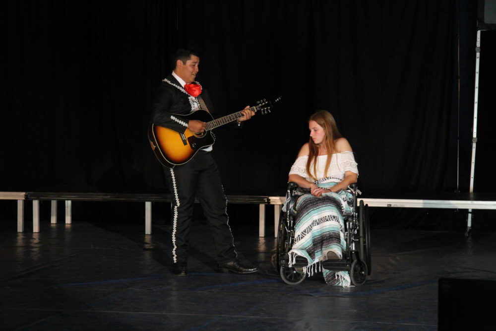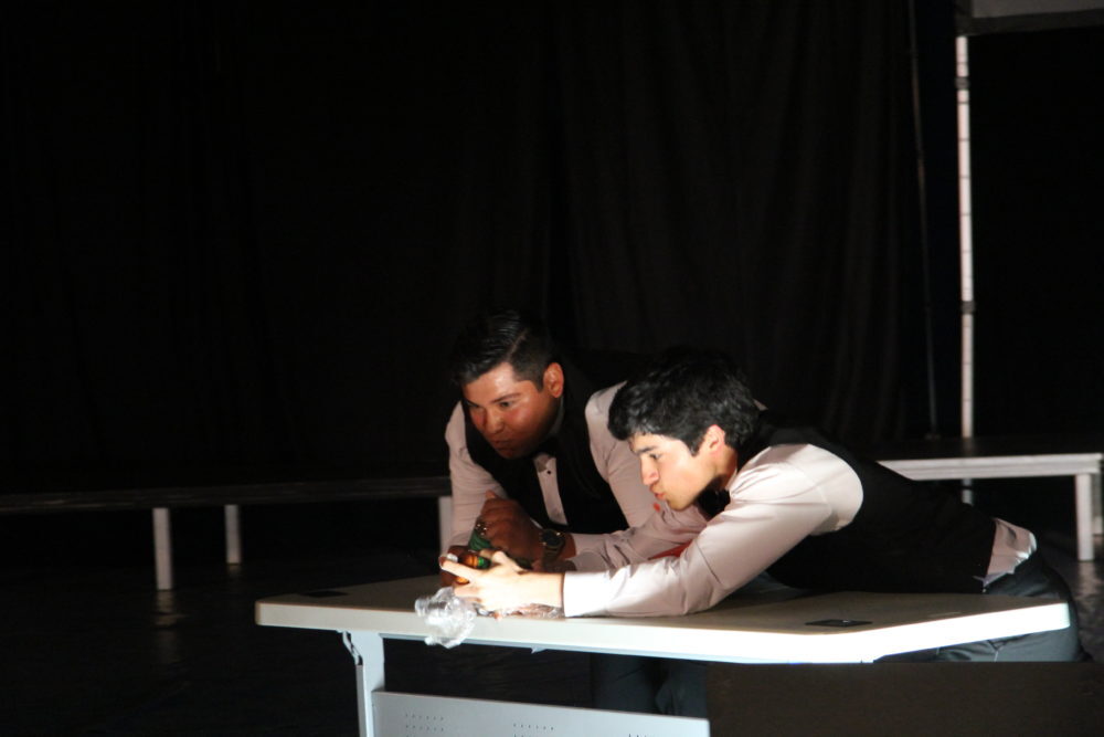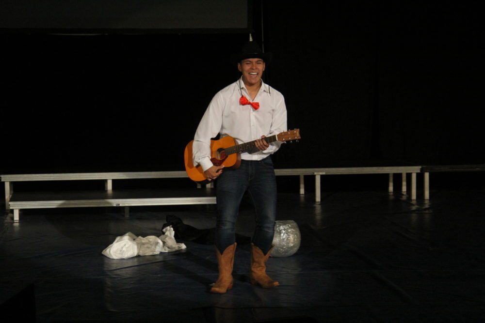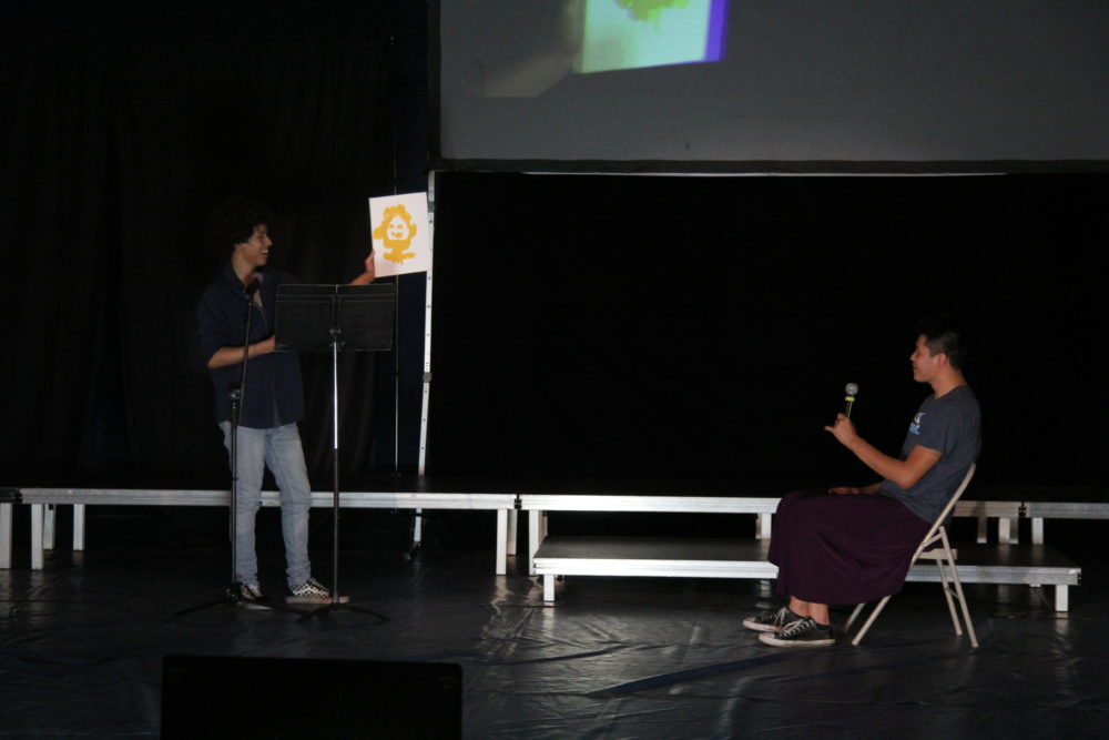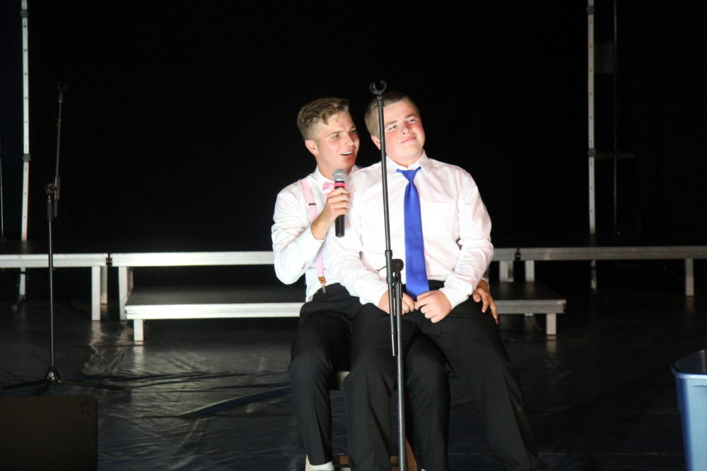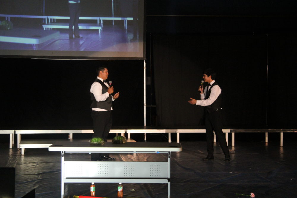 Matthew Mallory and Oscar Benitez perform a series of skits; Mallory plays the piano while Oscar attempts ballet, they read “A Woket in my Pocket” to the tune of “Walk it like I talk it” by Migos and spin around on bats. Photo by Vivian Yenson.