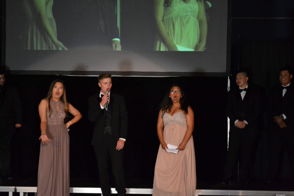Senior Lexie Geltman and junior Natalie Scott come out as the masters of ceremonies. Photo by Vivian Yenson