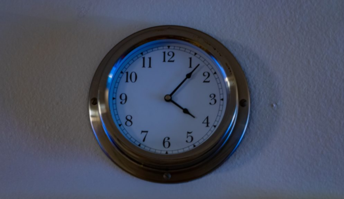 Clock reads 4:07 in the morning demonstrating the extremes some students have to wake up in order to get in their work. Photo by Timothy Roe.
