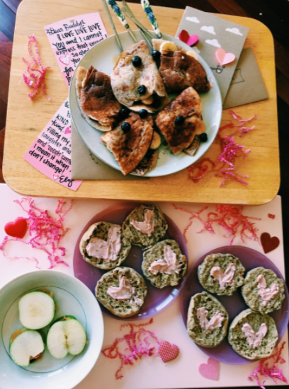 Food is the backbone to any party, so make sure to have your menu stocked with hearty foods. You can find a lot of cool Valentines-themed dishes on Pinterest. And if you’re feeling a little lazy to hit the grocery store, simply mold whatever food you have in your kitchen into heart shapes to make it instantly Valentine-themed. Some of the foods my friends and I made were English muffins topped with strawberry whipped cream cheese in the shape of a heart and some blueberry crepes made out of scratch.