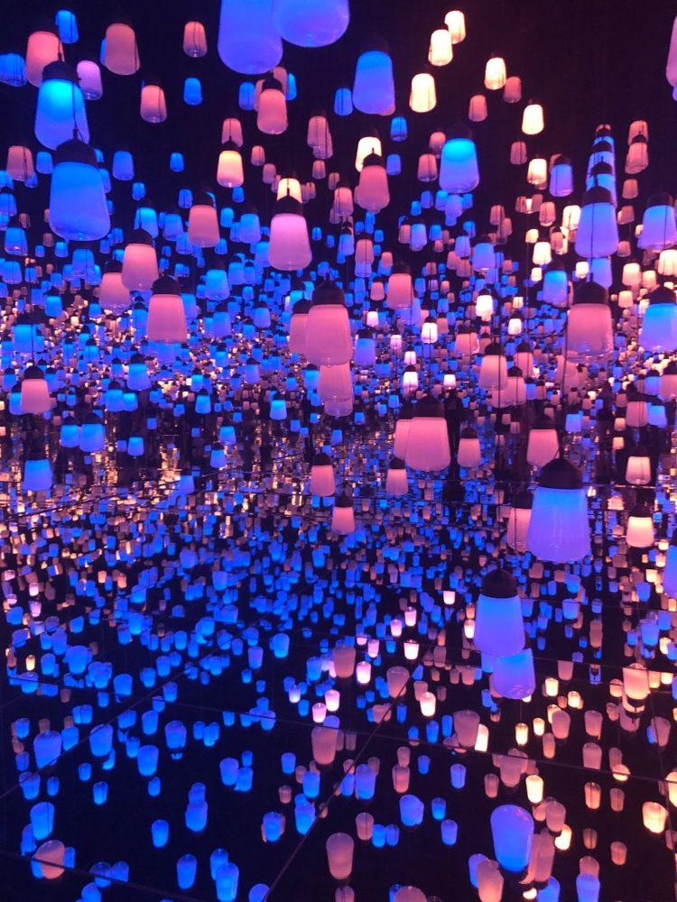 Team Lab Borderless is in essence, a visual effects building where each room has a variety of things to offer. Even though I’ve (and probably you’ve) seen photos of it online, nothing compares to actually living through it. Honestly, you could stay there for hours and not get tired of watching the different images flash by in an array of colors. My favorite part about it was probably the “Undou no Mori” or “Exercise Forest” that not only played on your sight for visual effects, but also on your body– the room was not level by any means and there were activities that got you moving around. Tanaka-sensei, senior Amy Fong and I jumped on a trampoline of sorts that had planetary objects react with every step you took on the surface. The whole experience was mind blowing and so aesthetically pleasing that I would love to go again.