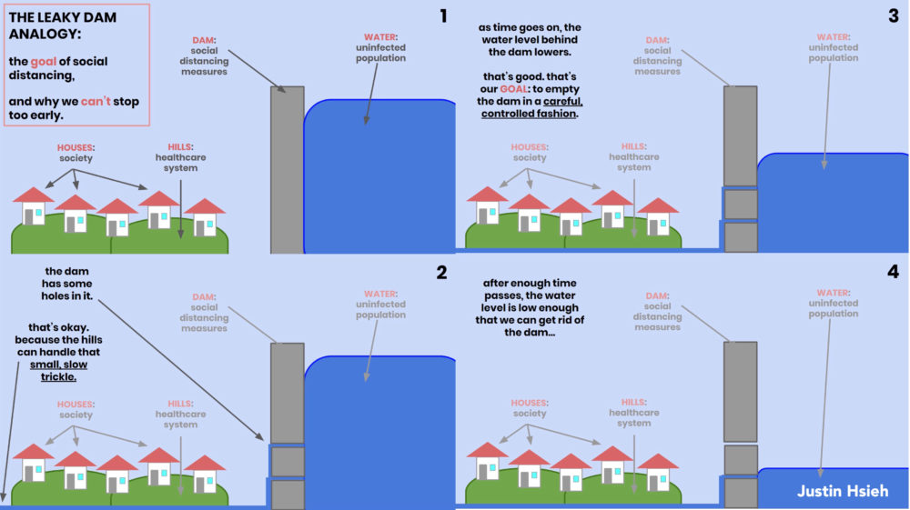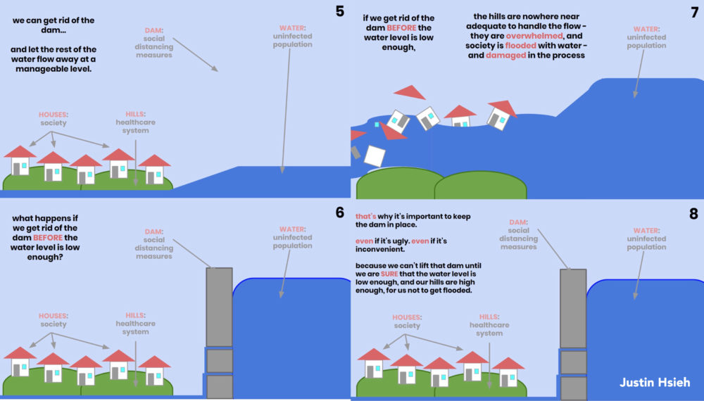 Social distancing won’t make COVID-19 go away, but it is imperative to slowing transmission and protecting the vulnerable. Infographic by Justin Hsieh.