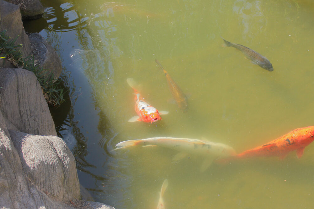 At the lowest level, a large lily pond is spotted with fish swimming underneath.