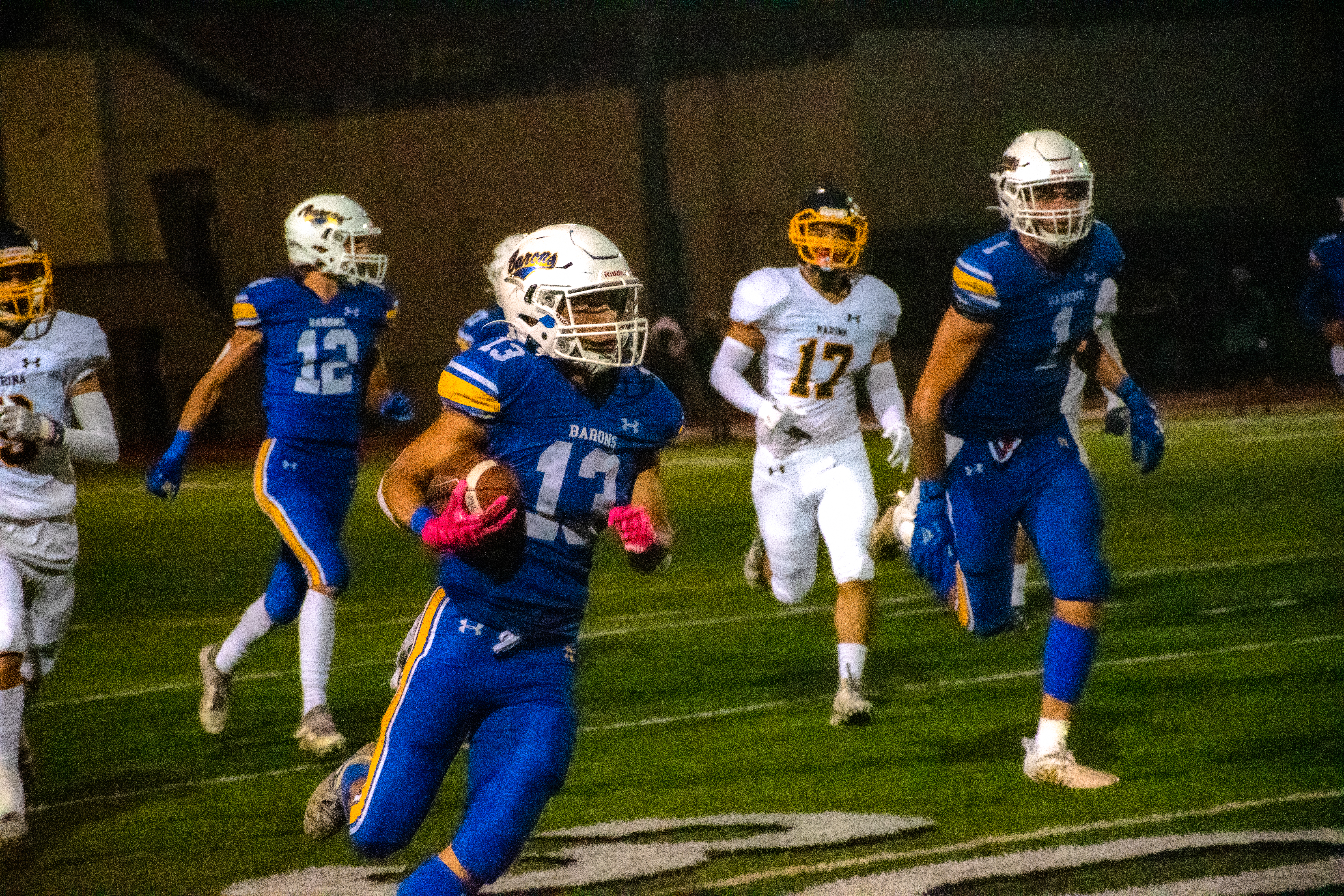 In their second home game of the season and on a rainy Friday night, the varsity football team blew out the Marina Vikings by a score of 45-14. The Barons improved their record to 3-1, with all four games being non-league matchups.