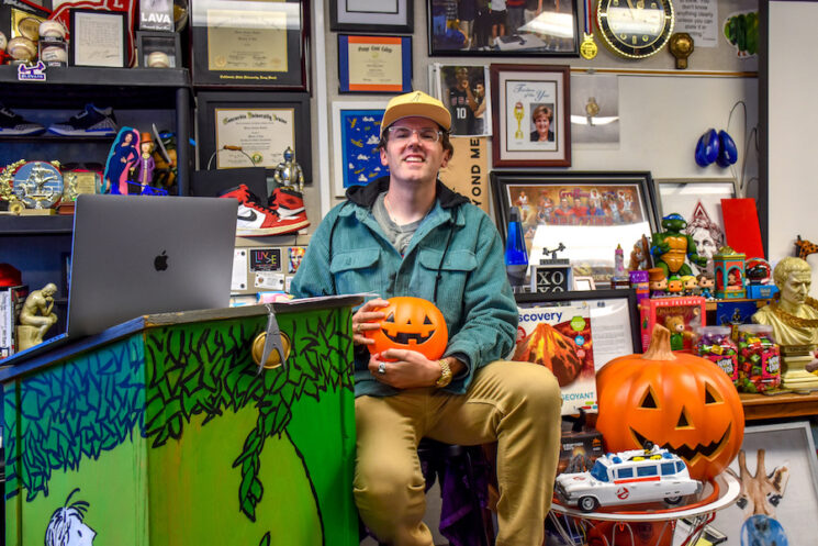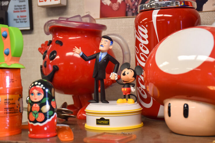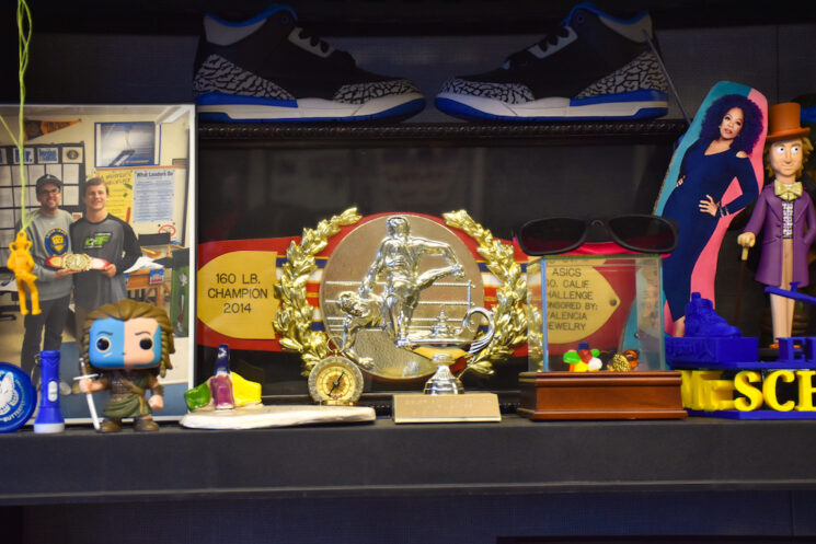 His room features photos of influential leaders, former students, and most prominently, toys.