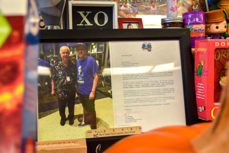 This is a framed letter from the former Vice President of the Orlando Magics, Pat Williams. This letter contains a request, asking Schultz to send in writings for a future Chicken Soup for the Soul Book.