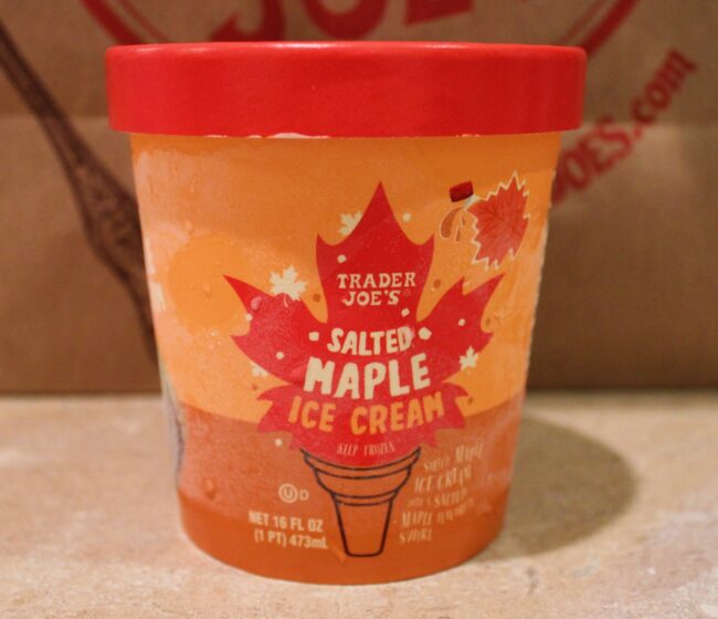 The limited edition salted maple ice cream is described as a “gloriously thick, decadently creamy, and decidedly rich ice cream flavored with real Maple syrup and balanced with a sprinkle of sea salt”. To continue to tap into the maple flavor, maple syrup is also swirled into the ice cream. The Trader Joe’s website also recommends adding their Just the Clusters Maple Pecan Granola Cereal on top of the ice cream for a bit of crunch.