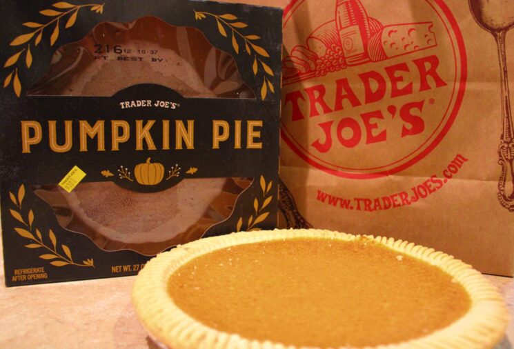 From first glance, you may regard this pumpkin pie as ordinary. And in many ways, it is. However nothing within such a store is exempt from a little bit of Trader Joe’s flair. The pie is packaged in a sturdy cardboard box, adorned with leaves surrounding the pie. The packaging is simple, yet practical and tells you exactly what you plan on purchasing from the get go.