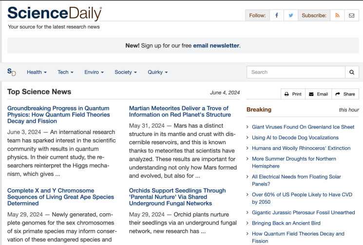 “Visitors can browse more than 500 individual topics, grouped into 12 main sections … covering: the medical sciences and health; physical sciences and technology; biological sciences and the environment; and social sciences, business and education,” ScienceDaily said on their “About” page.