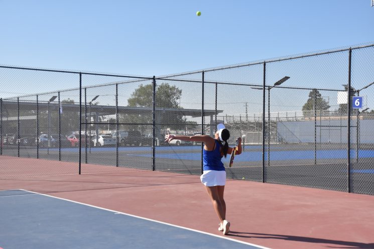 Fountain Valley High School’s number three singles player junior Chloe Vu fought hard in her first game to win with a score of 6-3. Her powerful overhard proved to be too overwhelming for her opponent.