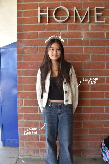 Junior Angelynn Tran: “My cardigan is from H&M and I just wore a basic black tank top. I don’t really know where it’s from. I’m wearing Birkenstocks and my jeans are from Edikted. I got [the necklace] from my grandma and [the bracelets] are gifts from my mom. I [find inspiration] on Pinterest and TikTok. I like to do a lot of online shopping, anything from Tiktoker Demetra Dias’ Closet,” junior Angelynn Tran said. “My sweater [and jeans are] from Brandy Melville. My cross is from Brandy Melville, my earrings are from Old Navy and this other necklace is from Missook. [The shoes are from] Converse,” senior Kayla Tran said.