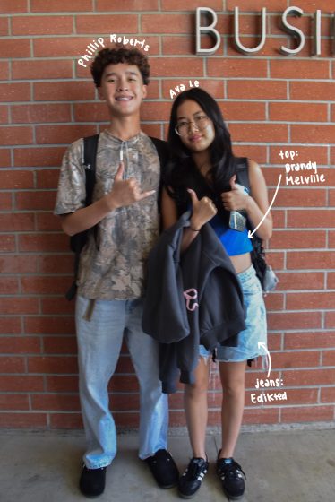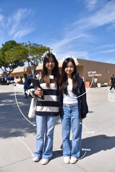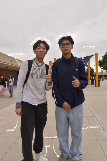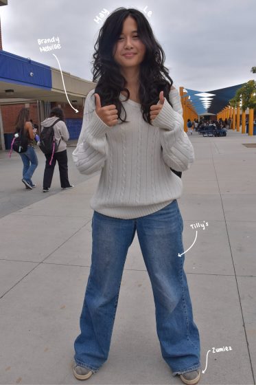 “My sweater is from Abercrombie. The shirt under is [from] Uniqlo. My pants are from Adidas and my shoes are Crocs. My inspiration is being comfortable and what the weather is. My go-to place for shopping is Abercrombie,” junior Hayden Nguyen said.“My top is from Brandy [Melville]. I got [my jeans] from Tillys. I think I got [the shoes] from Zumeiz. [My inspiration] is that [TikToker] Demetra,” freshman May Le said.“My top is from Brandy Melville. [The jeans] are from Edikted. [The shoes] are Adidas Sambas. My necklace is from Brandy Melville. My second piercing is from Etsy and then my first piercing is from Brandy Melville. Usually TikTok [inspires me for my outfits]. My go-to place for shopping is Brandy Melville or Edikted,” junior Ava Le said.