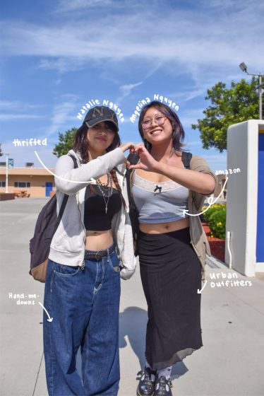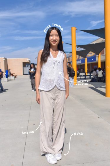 “My top is from Urban Outfitters. [My jacket is] from my brother’s closet. [The jeans] are from Garage. [All the accessories] are from Apparel. [The shoes are from] Reebok. Pinterest [inspires me],” senior Pearline Truong said.“My top is from Forever 21. My pants are from Amazon. My shirt is from Amazon also. My shoes are from nike. My necklace, I made [it] because I own a small business and my earrings are also made by me. I just really like fashion and the way you can express yourself with your clothing. I get [inspiration] from my sister and pinterest,” junior Alina Troung said.“I think [the top] is from amazon . . . I thrifted [the jacket]. My skirt is from Urban [Outfitters]. My shoes are Onitsuka Tigers from Japan. [My accessories] are thrifted as well. I want to feel good, so I put on clothes I like. I think I take inspiration from my friends the most. [My go-to place for shopping] is probably the thrift store,” sophomore Angelina Nguyen said.
