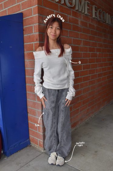 “I thrifted [the top and jacket] from Crossroads. I got [my jeans] from my sister. My shoes are Doc Martens. I thrifted my [necklace]. I like to see what’s unique. Trends are nice but also finding a bit of yourself in [the] trends. [My go-to place for shopping is] the thrift store,” sophomore Natalie Nguyen said.“My top is from Amazon. My jacket is from Ross. My jeans are also from Ross. [My shoes are from] the Doc Marten store. I made my earrings myself. My hair clip is from Hot Topic. I’m also open to commissions for earrings and any type of jewelry. Creative passion in the industry of fashion [inspires me]. My go-to places [are] online, or Ross really anything that’s in the budget,” freshman Taylor Lam said. “My top is from Q. I got it from Irvine Spectrum. I got [my pants] from a store in Japan called Gu. My shoes are from Onitsuka Tigers. My necklace is [from] Tiffany. I see a lot of my outfit [inspiration] on TikTok and Pinterest. I would say [my go-to place for shopping] is H&M and Hollister,” sophomore Audrey Chau said.“[My jacket is from] Reebok. [The jeans are from Hollister]. [The shoes are] Birkenstocks. [My go-to place for shopping] is Pacsun,” junior Jeremy Hong said.