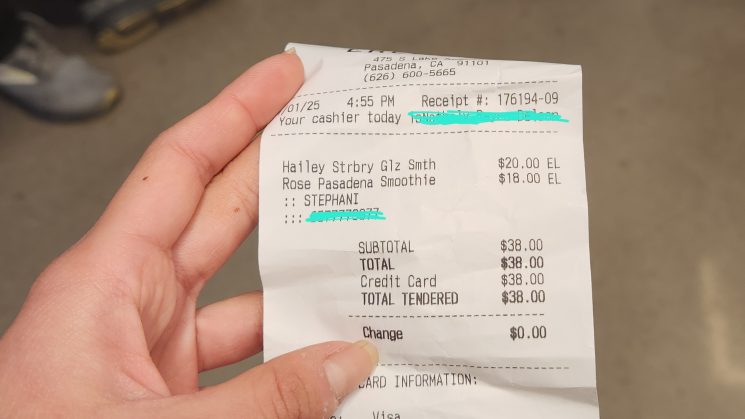 The Rose Smoothie caught my eye. Perfect for the Rose Parade in the city, it had rose water, almond and coconut milk, beet juice, strawberries, bananas, goji berries, maple syrup, lucuma, coconut cream and vanilla stevia. I tried out rose milk before, so I was hoping the drink would have a strong rose flavor too. Floral flavors are underrated and it’s nice to see them occasionally. As for my brother (who I almost forgot), he got the Hailey Bieber smoothie. It has almond milk, banana strawberries, avocado, dates, maple syrup, vanilla collagen and stevia, sea moss, coconut cream and strawberry glaze.