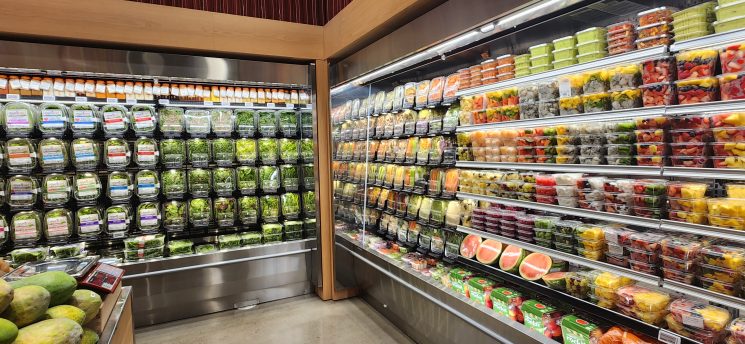 Inside, my eyes adjusted to the blinding lights and colorful shelves. Everything was in order. The produce was neatly stacked on top of each other, the packaged fruit salads organized by color and type, the fruits remaining in the boxes they belonged to; they were like fake props for a stage set. Not a fruit or vegetable was out of place. At the stores I’ve been to, there’s always a misplaced item left by customers.