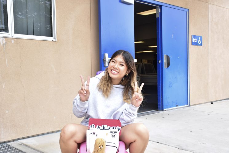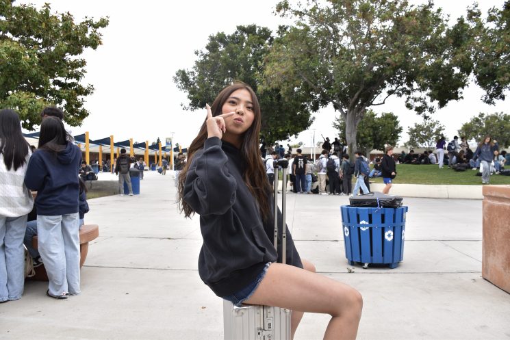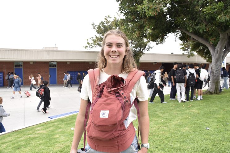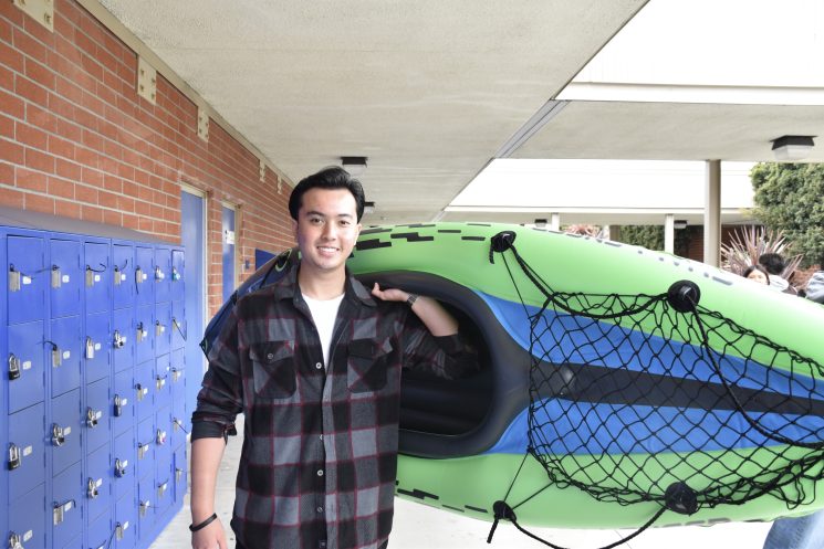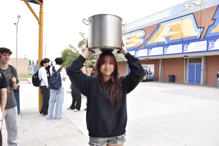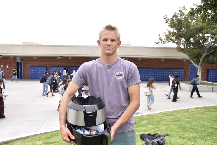 “I brought an air fryer. It’s pretty simple. I tossed all my stuff into an air fryer and cleaned it out a little bit, [because] I wanted [to do] something fun for my senior year,” senior Charlie Kosh said. “I always bring food to my Sports Med class during third period, so I thought, why not bring something different today? I tossed some frozen stuff from my bag into the air fryer, and in the middle of class, I just popped it out and started cooking.”“I brought a baby carrier that goes on your stomach,” senior Anna Quist said. “I just had it lying around, and it’s not technically a backpack since it’s worn on the front. I think it’s funny because it looks like I’m carrying a baby; you can’t really see my stuff, so it just looks like there’s a baby in there.”“I brought a Kirkland jasmine rice bag. I just saw it lying there in the kitchen and thought it’d be pretty funny since I’m Asian. It was just the most random thing I could think of,” senior Jake Nguyen said.“So I didn’t really know what to use so I went to my pantry, and I saw a lot of pots, and I thought that they would fit all my stuff in there,” sophomore Natalie Nguyen said. “I like it because my dad cooks pho in it.”“I looked in my closet and saw the luggage, and I decided, hmm, sounds pretty good to bring it to school. I like strolling around and crashing into people when they go into class,” sophomore Natalia Le said.“I brought my little baby sister’s pink car. So basically, it’s like a little push cart, and in the front trunk, I put all my stuff in it,” sophomore Ava Nguyen said. “It’s very fun because I get to roll around in it, and it’s just—I just feel like I have so much aura with it.”“I thought [about], what can I bring that is gonna scare everybody and shock everybody? What can I bring that is the largest thing in my garage that I can actually carry on myself? And it turns out it’s the inflatable kayak,” senior Derek Ngo said. “The sheer size is really amusing, right? Everybody comes here with a small backpack—maybe a bag, a cereal box, whatever it may be—and I come in here with a full-grown freaking inflatable kayak. The shock factor is what’s great about it.”