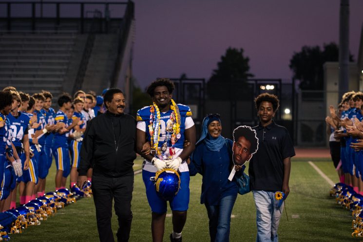 As a part of their Senior Night, senior players walked alongside their family and friends between their teammates. Senior Munir Beshir walks with his family. Photo by Leroy Tran.