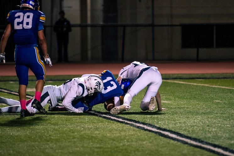 Junior Raymond Dillon catches a pass deep in enemy territory before being tackled. Photo by Leroy Tran.