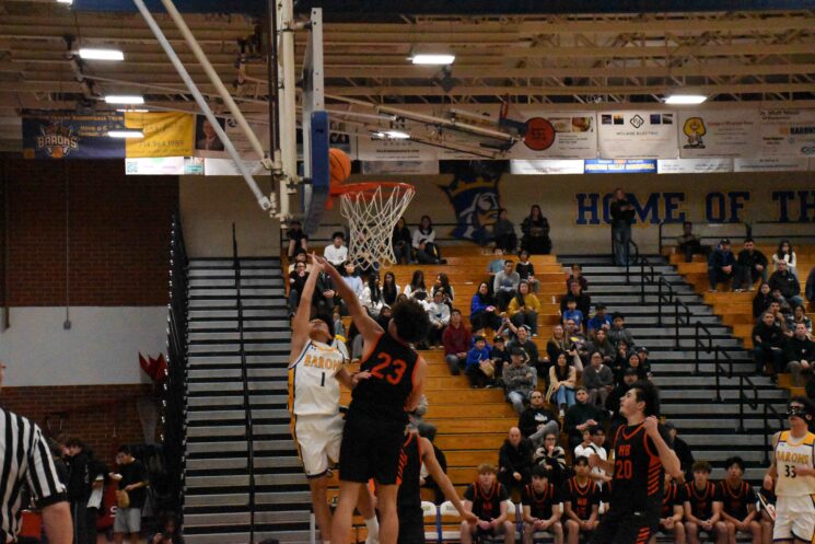Isaac Chinchilla takes the rebound and makes the final shot of the game, ending with a score of 56-49, putting another win in the books for the Barons’ season.