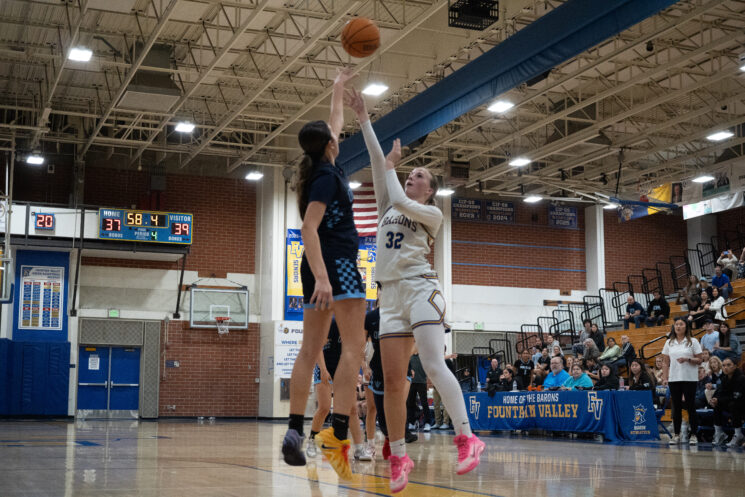 On Tuesday, Jan. 20, Fountain Valley High School (FVHS) girls’ basketball (3–3 league, 12–10 overall) battled against the Corona Del Mar (CDM) Sea Kings in an intense matchup that pushed both teams to their limits. In the end, the Barons fought hard for a 47–42 overtime victory on their home court. Key players included senior Sophie Hsieh with both strong defense and offense and senior Avery Jones with strong defense.