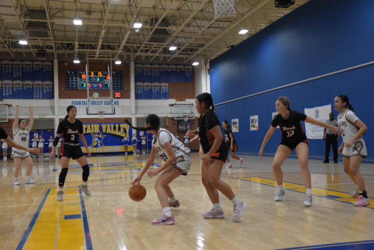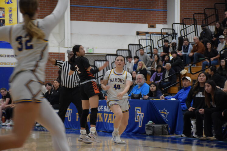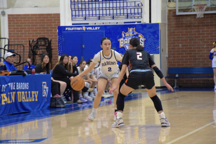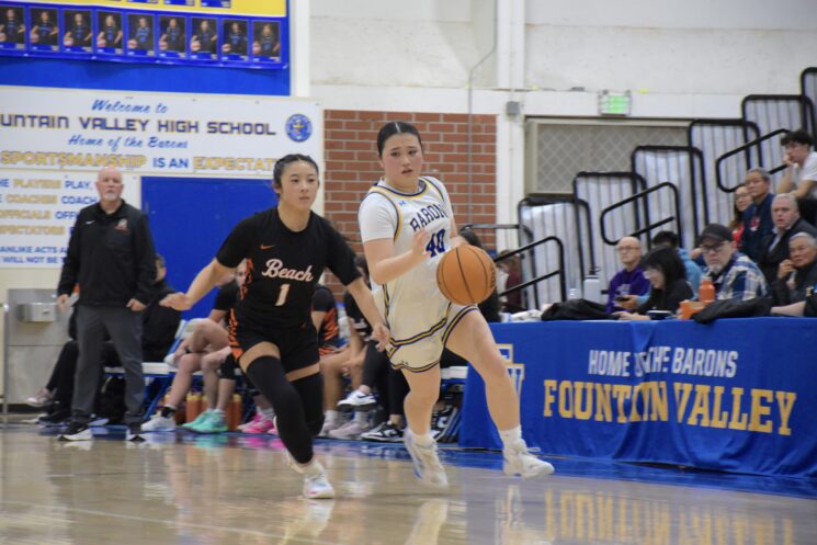 On Tuesday, Jan. 27, the Fountain Valley High School (FVHS) (5-6 league, 14-13 overall) girls’ basketball team played against the Huntington Beach High School (HBHS) Oilers for their senior night. Five seniors were recognized, including Sophie Hsieh, Kailyn Huynh, Avery Jones, Kailey Nishi, Kaylana Sitanggan and Helen William. The Barons fought hard but lost to the Oilers 47-60.